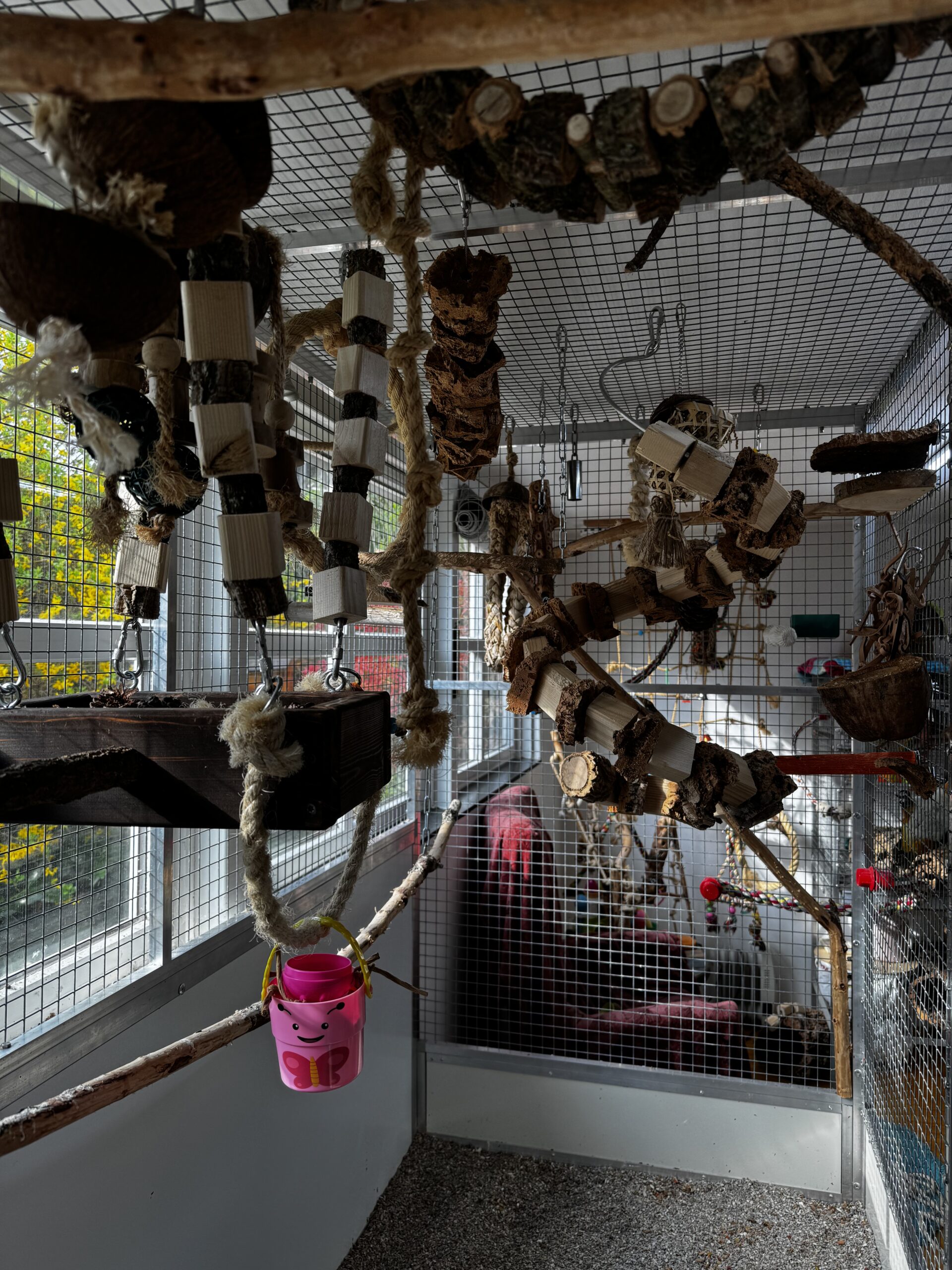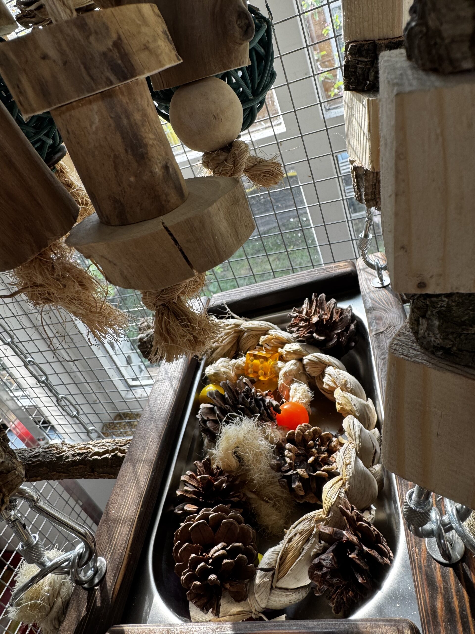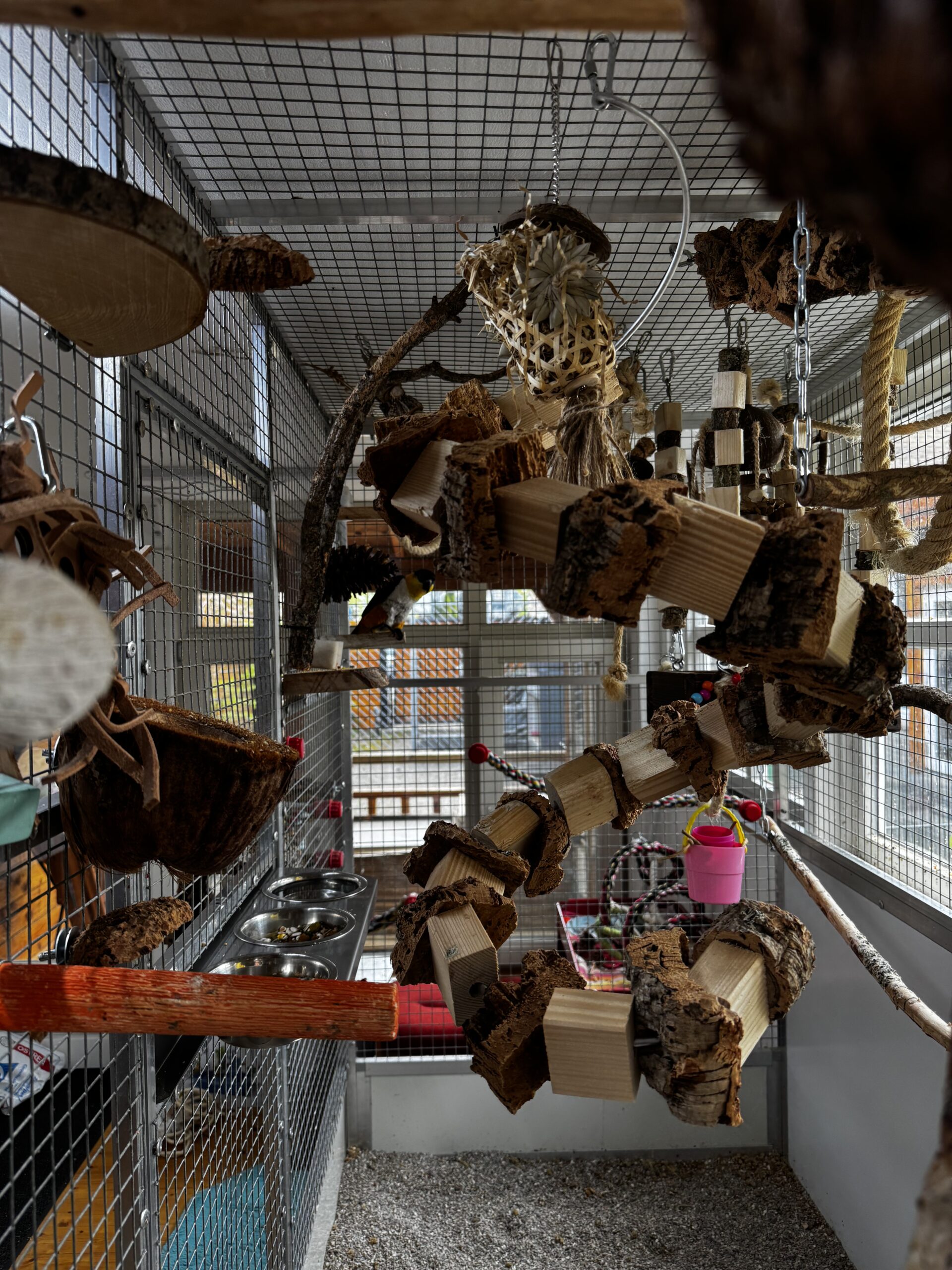 Wij kiezen het liefst voor natuurlijk speelgoed en aankleding van het hok! Kurk is erg leuk voor papegaaien omdat ze dit lekker kunnen slopen. Maar denk ook aan veilig hout, sisal touw, kettingen, leren veters etc! Wij kopen veel van ons speelgoed bij Avonturia