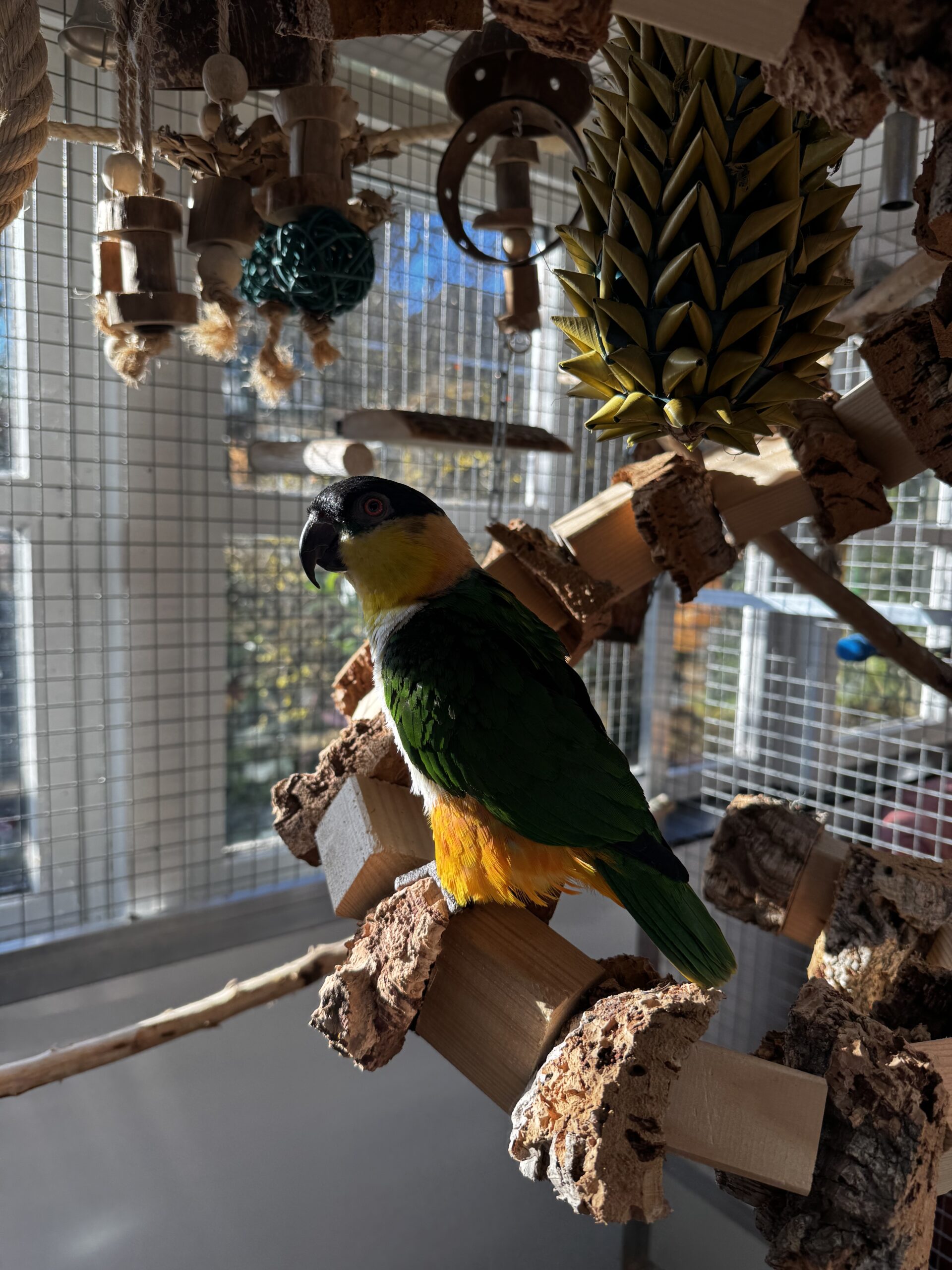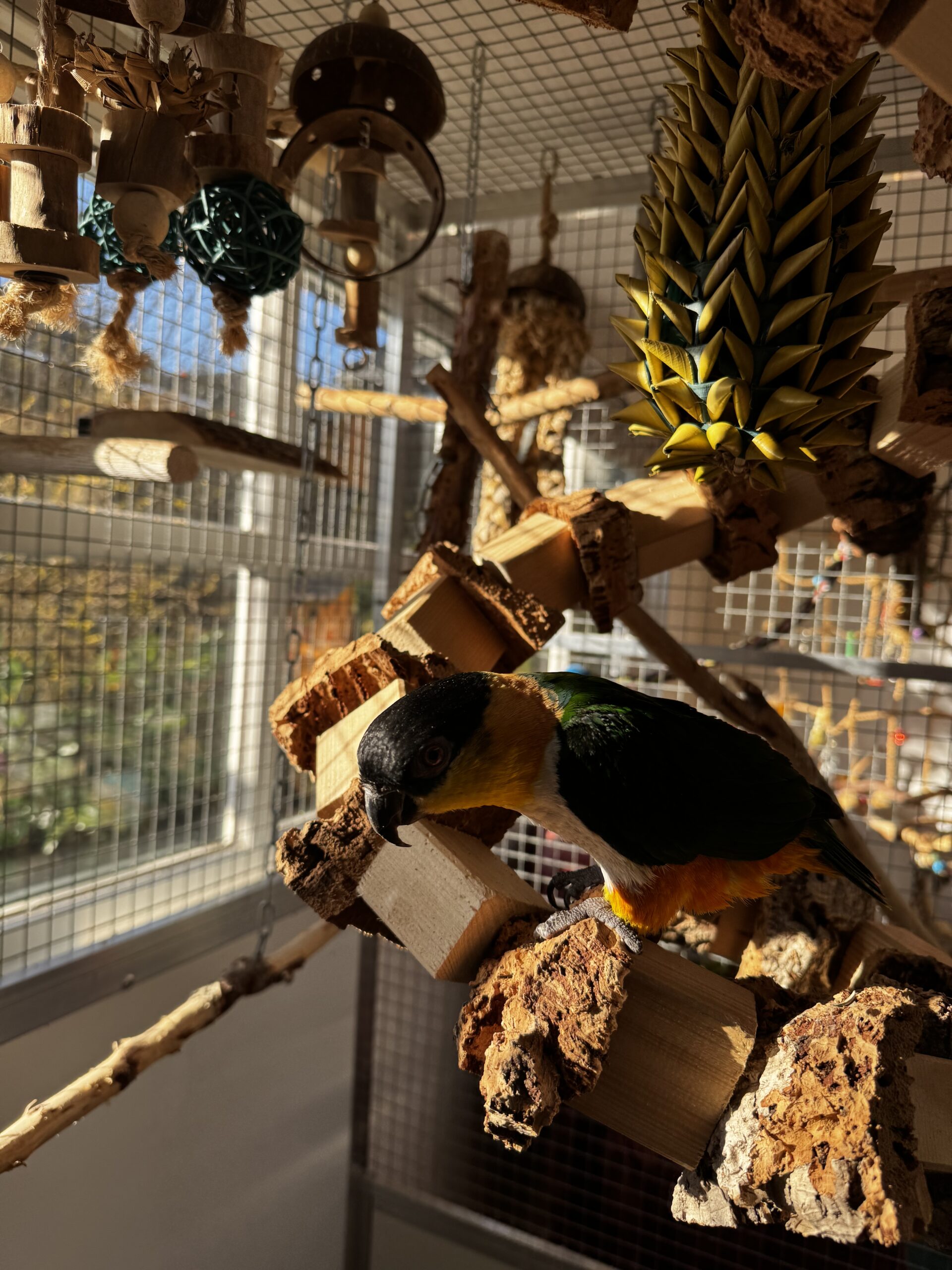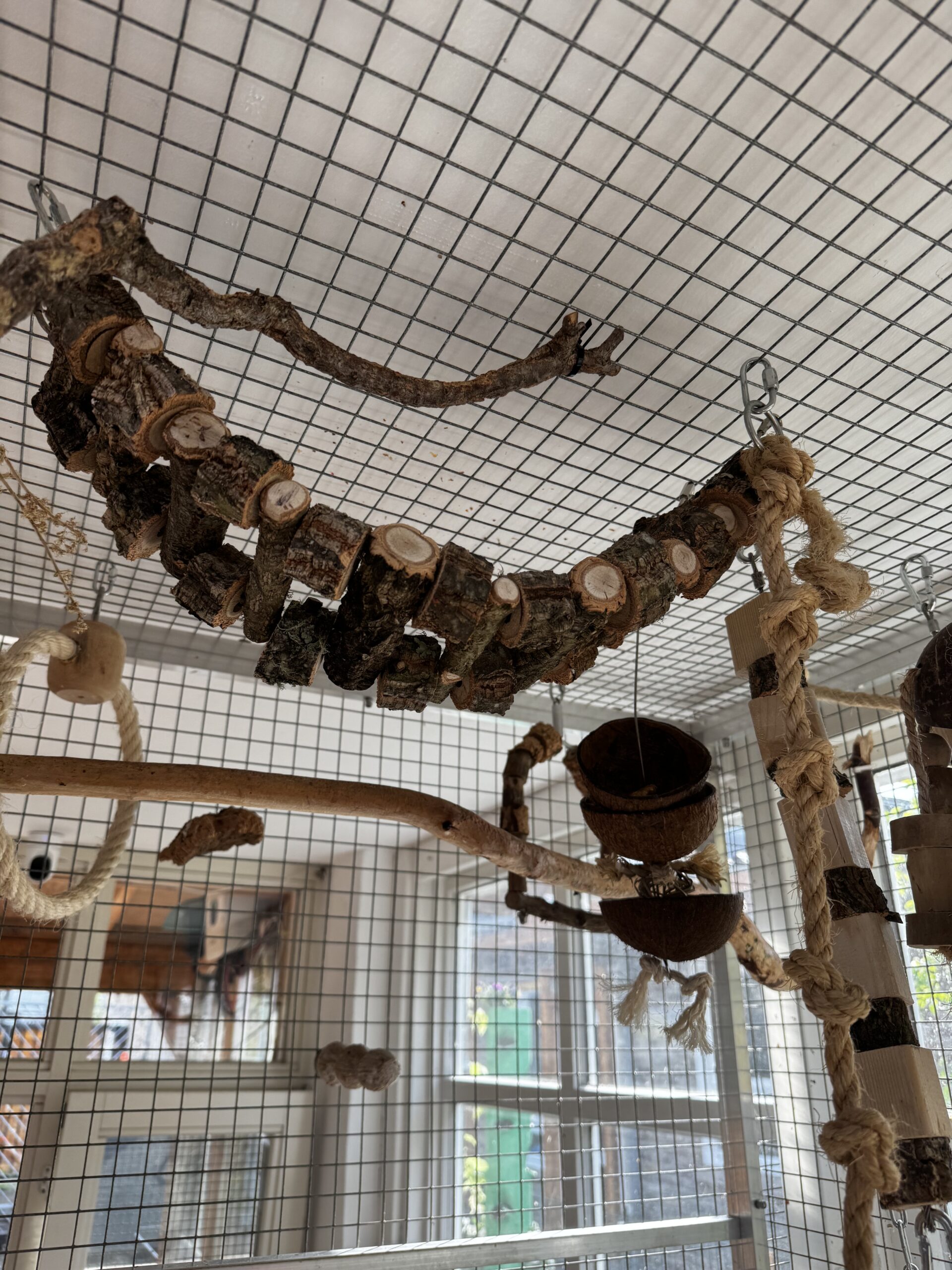 Wij kiezen het liefst voor natuurlijk speelgoed en aankleding van het hok! Kurk is erg leuk voor papegaaien omdat ze dit lekker kunnen slopen. Maar denk ook aan veilig hout, sisal touw, kettingen, leren veters etc! Wij kopen veel van ons speelgoed bij Avonturia