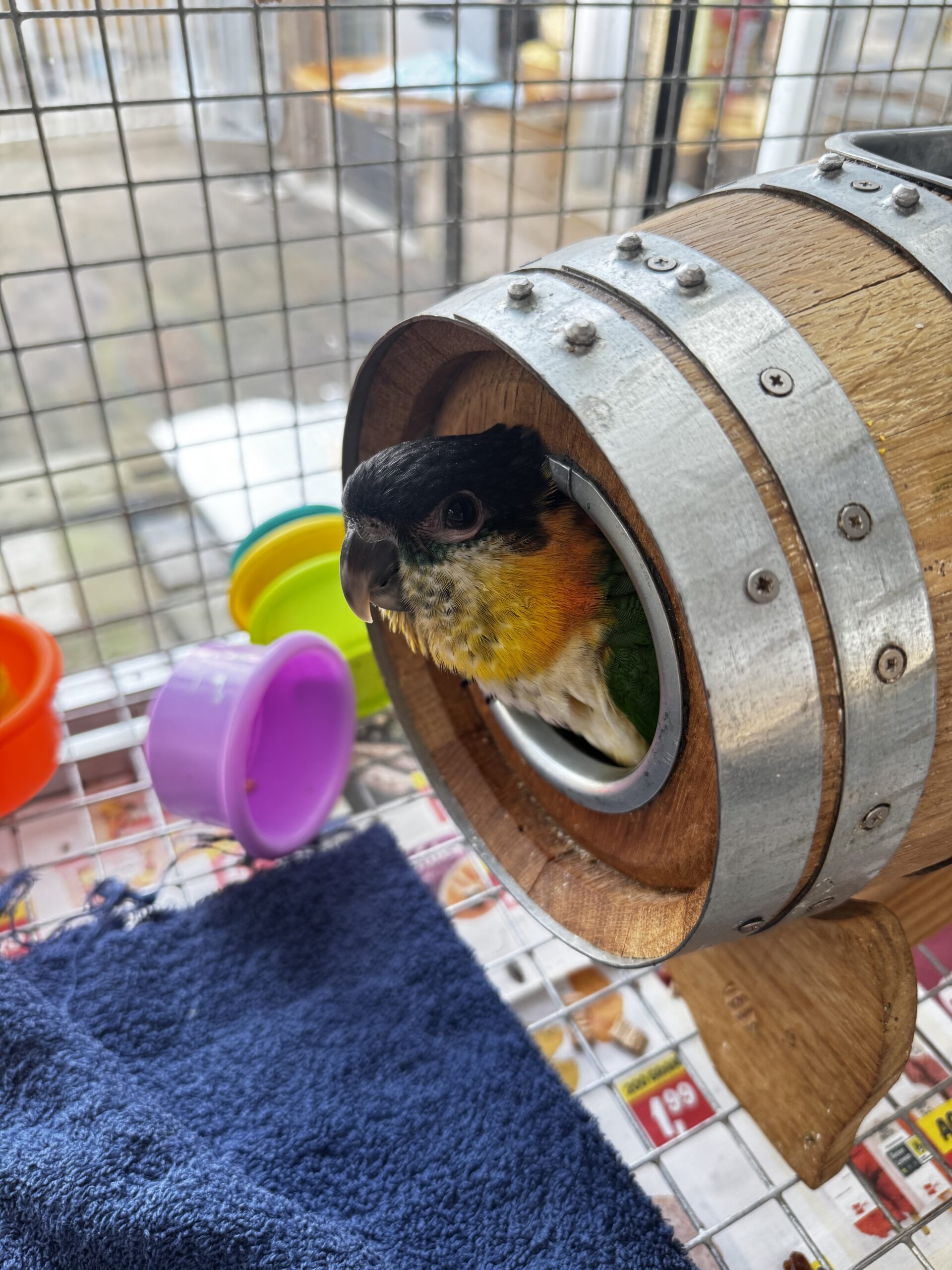 Zelfgemaakt is vaak nog het leukst! Dit paradijs hebben wij zelf bedacht en onze caiques (Zelfs de amazones!) vinden het prachtig. De Caiques houden van holletjes, tentjes en gaten waar ze doorheen kunnen kruipen. Dit is zo ongeveer hun paradijs. Zorg wel dat je hout gebruikt waar aan geknaagd kan/mag worden en dat niet schadelijk is voor de vogels! Enneh… Altijd onder toezicht he!