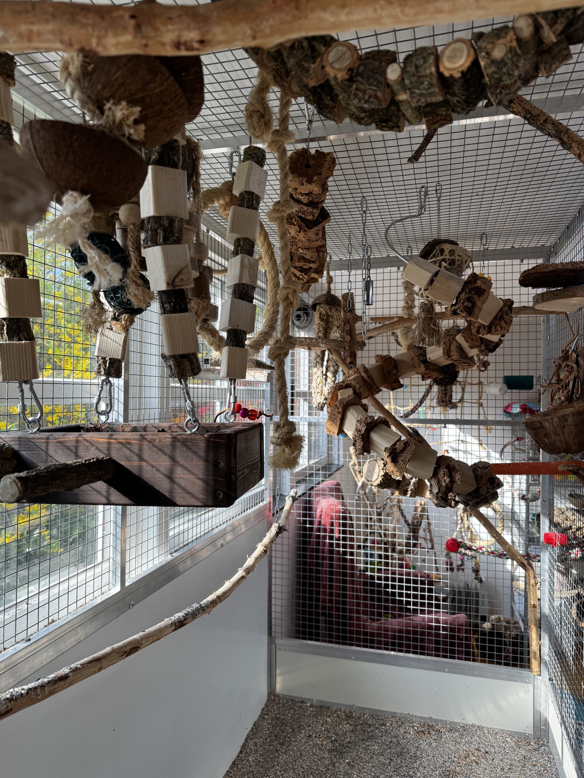 In de vogelkamer hebben we verschillende speeltjes hangen! Deze vinden alle vogels leuk! Onze grijze roodstaart schommelt net zoveel als de Caique’s, en als ze los zijn, vliegen ze gemakkelijk van de ene schommel naar de andere. Deze speeltjes vind je in papegaaienzaken, zoals bijvoorbeeld Lorre en Co maar ook bij Avonturia
